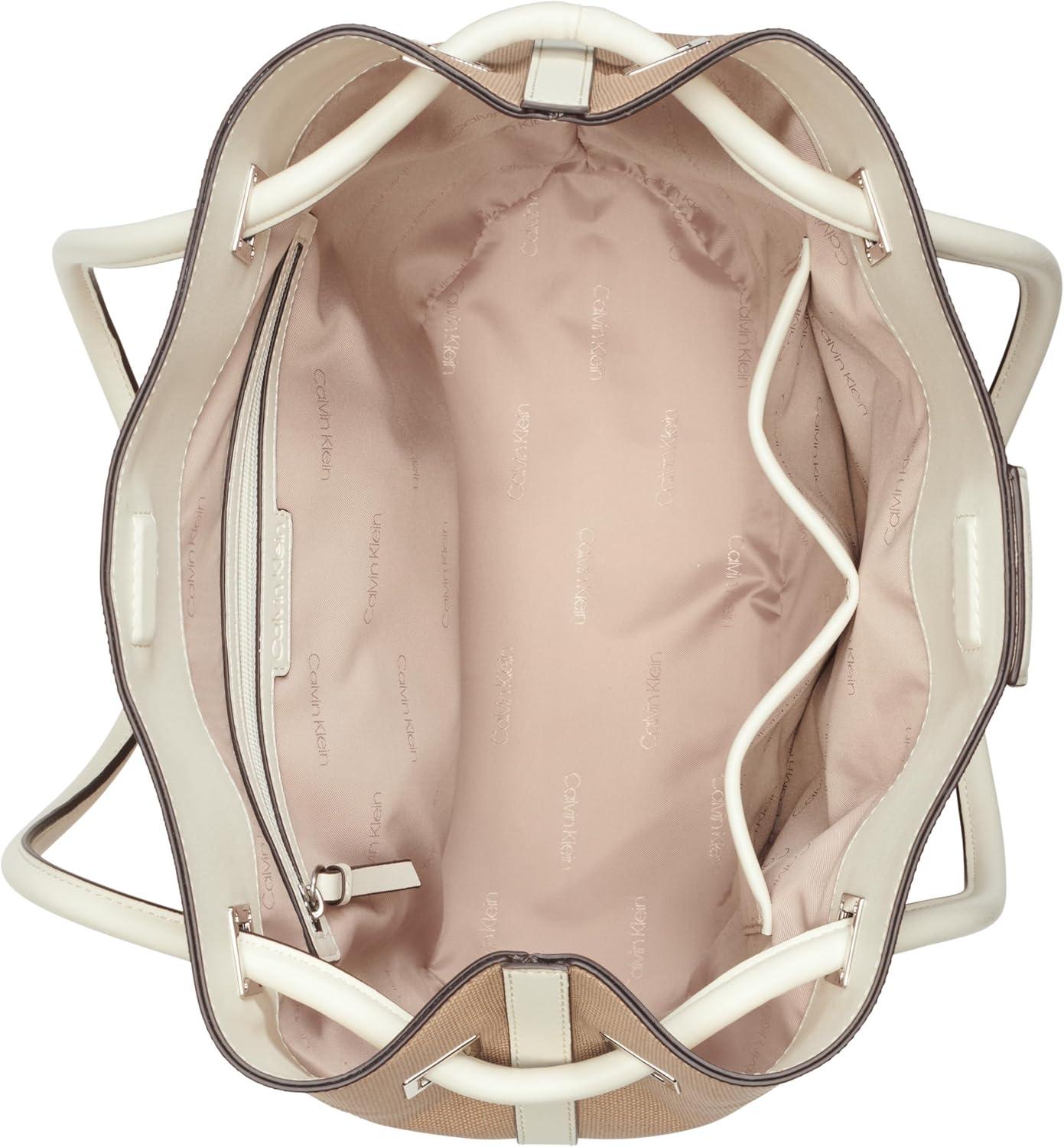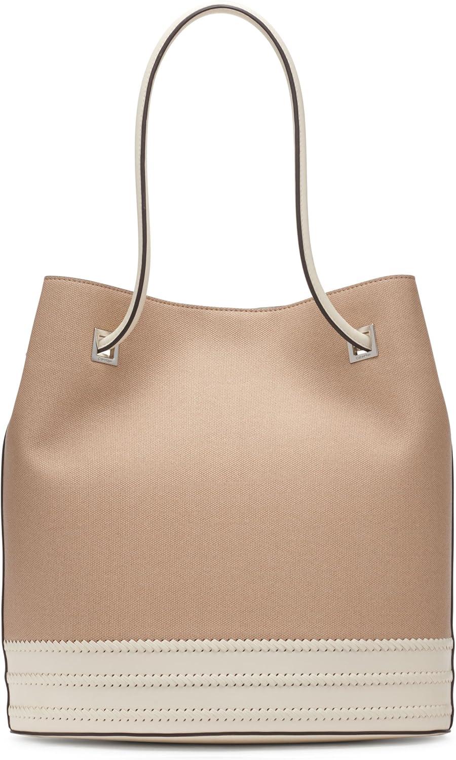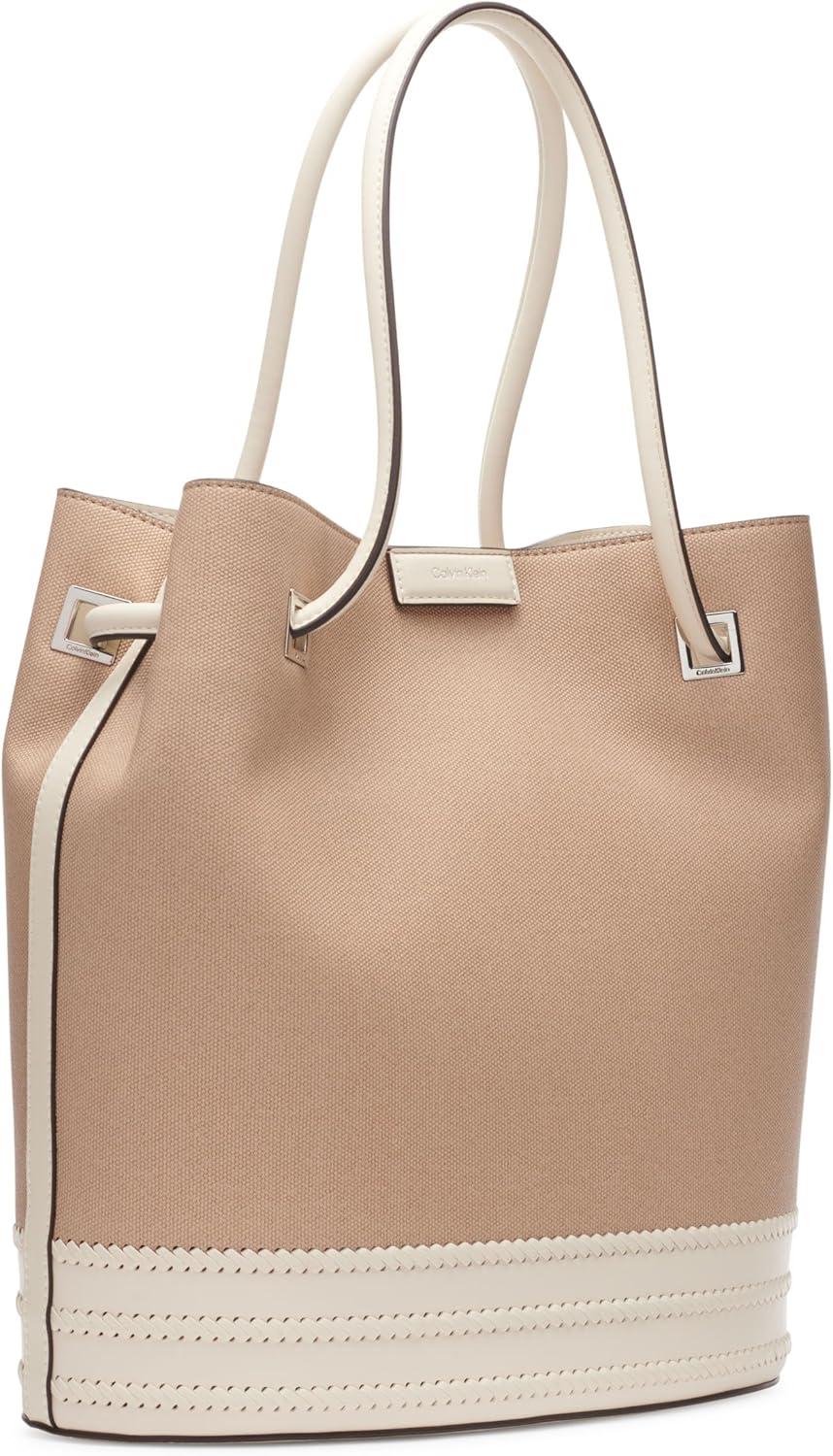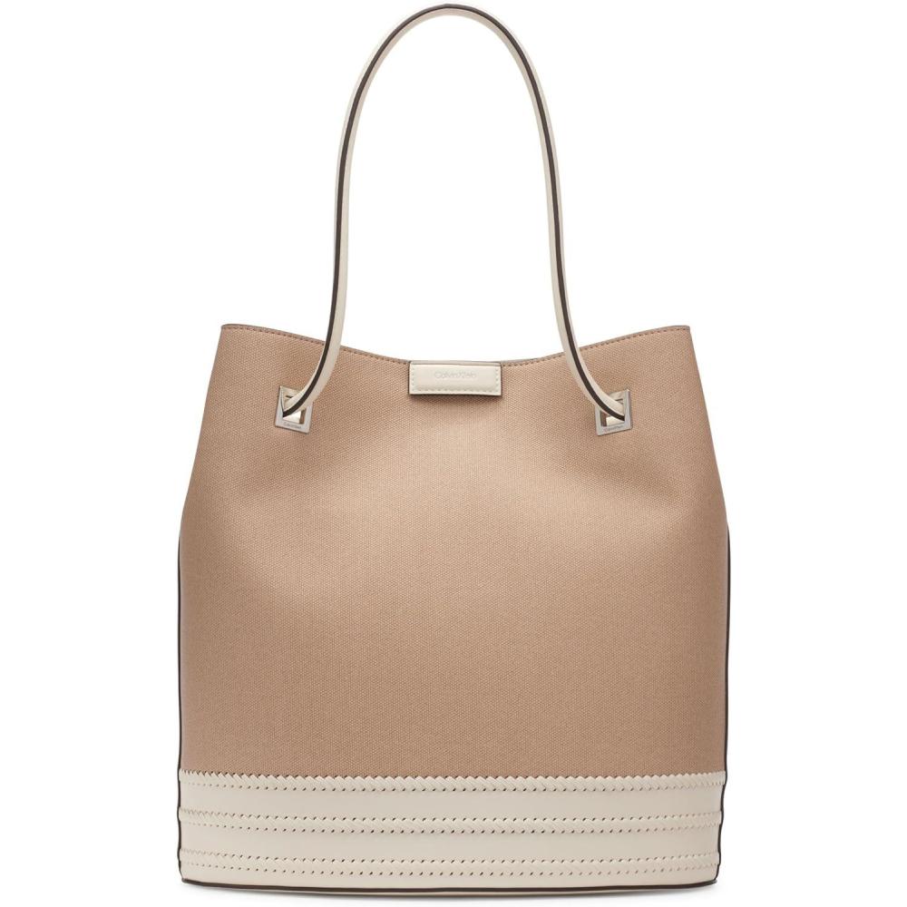 Calvin Klein Ash Tote Bag – North/South, Vegan Leather, 2 Pockets(Natural/White Canvas)