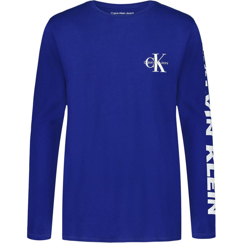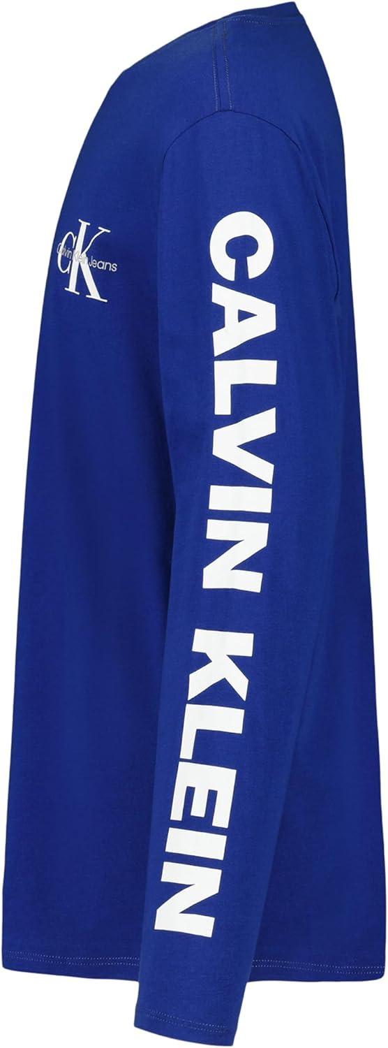 Calvin Klein Boys’ Long Sleeve Crew Neck T-Shirt, Soft, Comfortable, Relaxed Fit(Bold Sleeve Bellwether Blue)