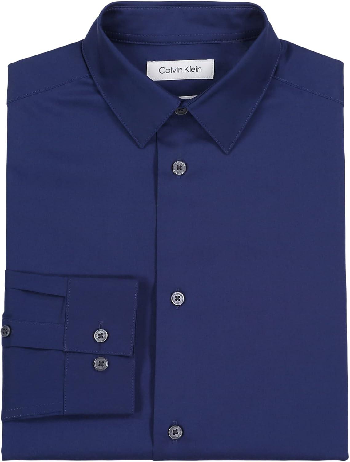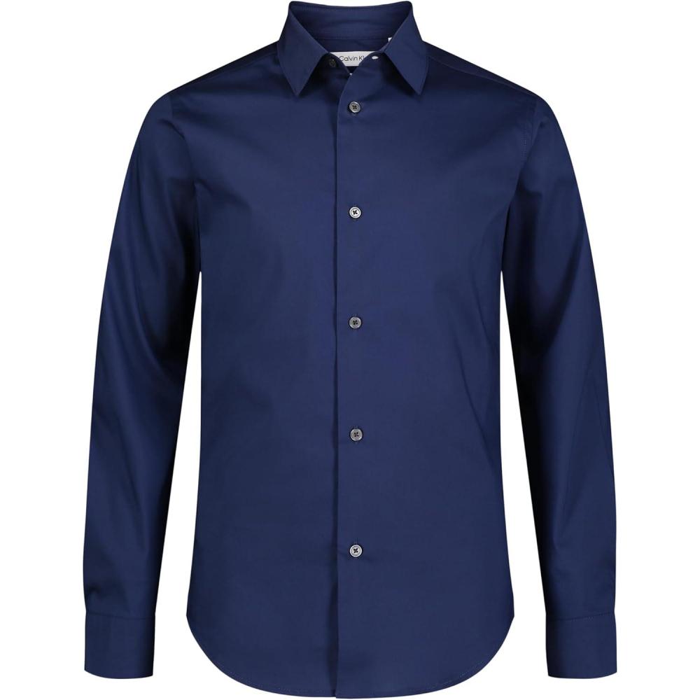 Calvin Klein Boys Long Sleeve Slim Fit Dress Shirt, Button-Down Style with Cuffs & Shirttail Hem(Blue)