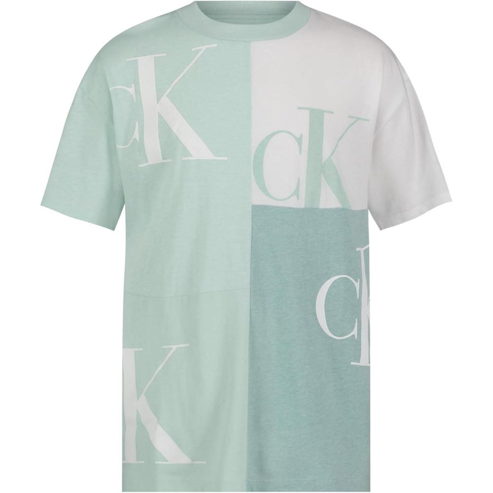imageCalvin Klein Boys Short Sleeve Fashion Graphic Crew Neck TShirt Comfortable Relaxed FitBlock Party Lt Sage Heather