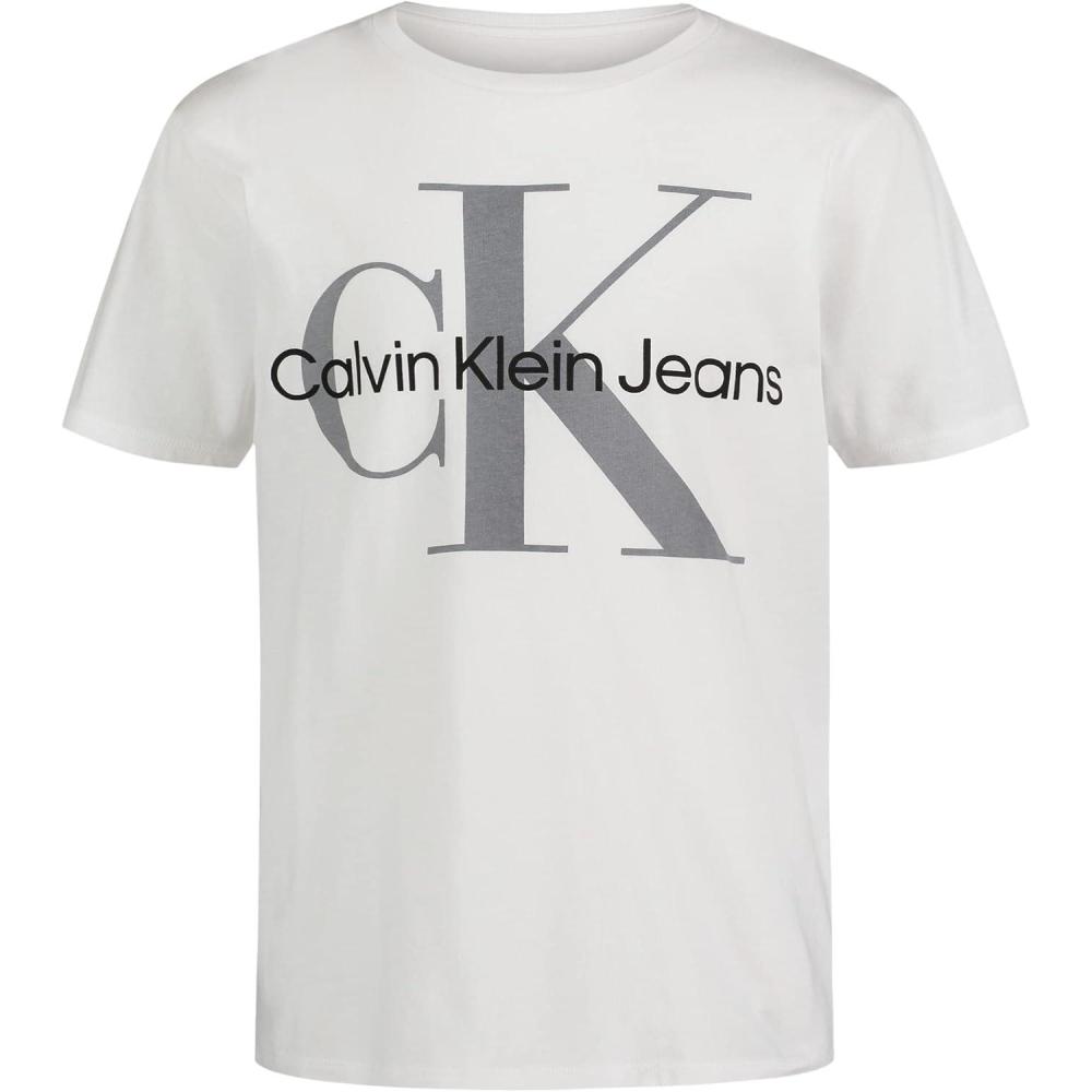 Calvin Klein Boys' Short Sleeve Logo Crew Neck T-Shirt, Soft, Comfortable, Relaxed Fit(Classic Mono White)