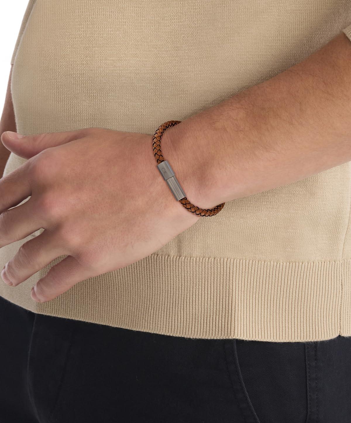 Calvin Klein Industrial Facets Jewelry Collection for Men - Leather Braided Bracelet with Adjustable Magnetic Closure - Premium Fashion Jewelry Accessory - Gift for Him(Gunmetal-Brown)