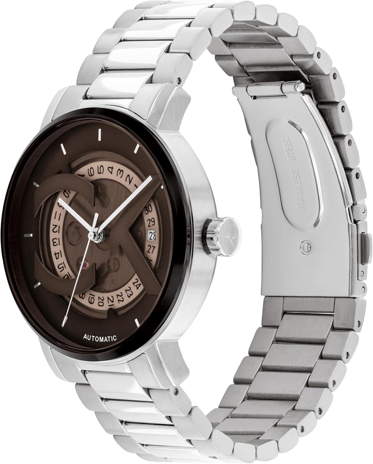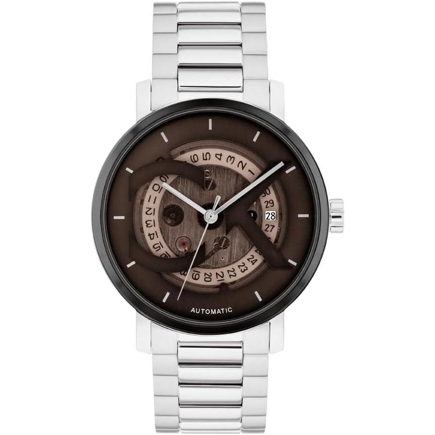 Modern and iconic, this watch features a fresh take on the CK monogram, elegantly “floating” on a skeleton translucent dial. Its automatic design includes an exhibition case back showcasing the battery-free movement.