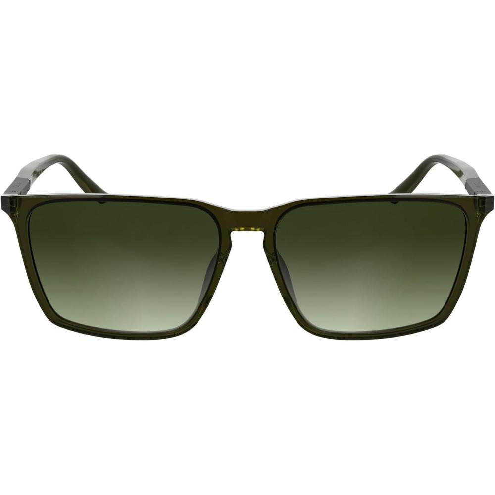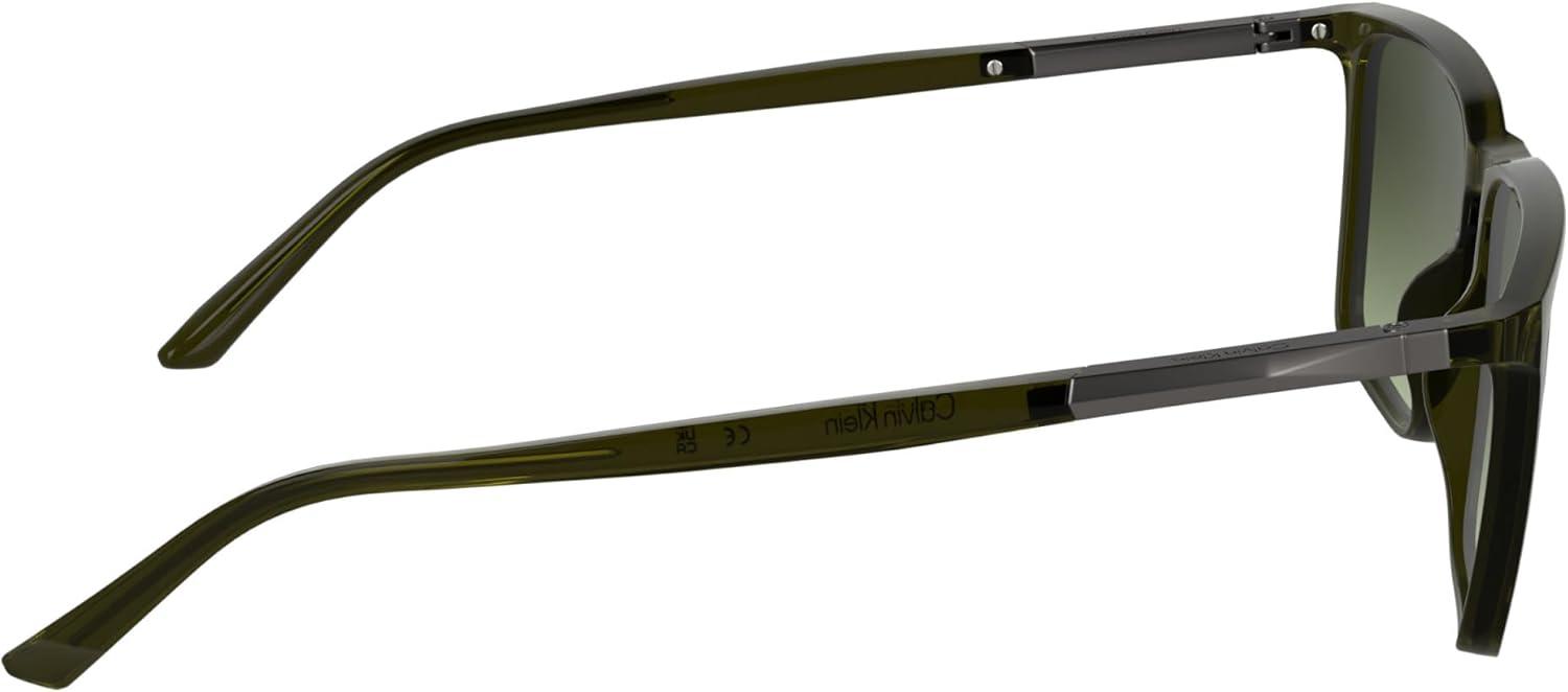 The green material front blends with metal temples, creating an elegant and modern contrast. The rectangular frame, with its keyhole bridge design on the nose, ensures a secure and comfortable fit. The metal detail on the temple, enhanced with the laser-engraved Calvin Klein logo, adds a touch of sophistication and functionality to the look.