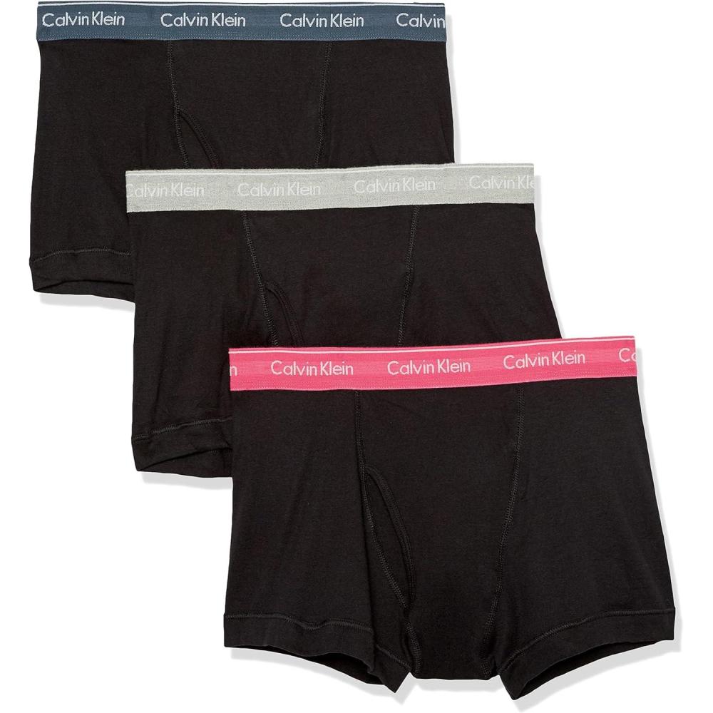 Calvin Klein Men’s Cotton Classics 3-Pack Trunk(Black Bodies W/ Cerise Lipstick Grey Heather Blue Edge)