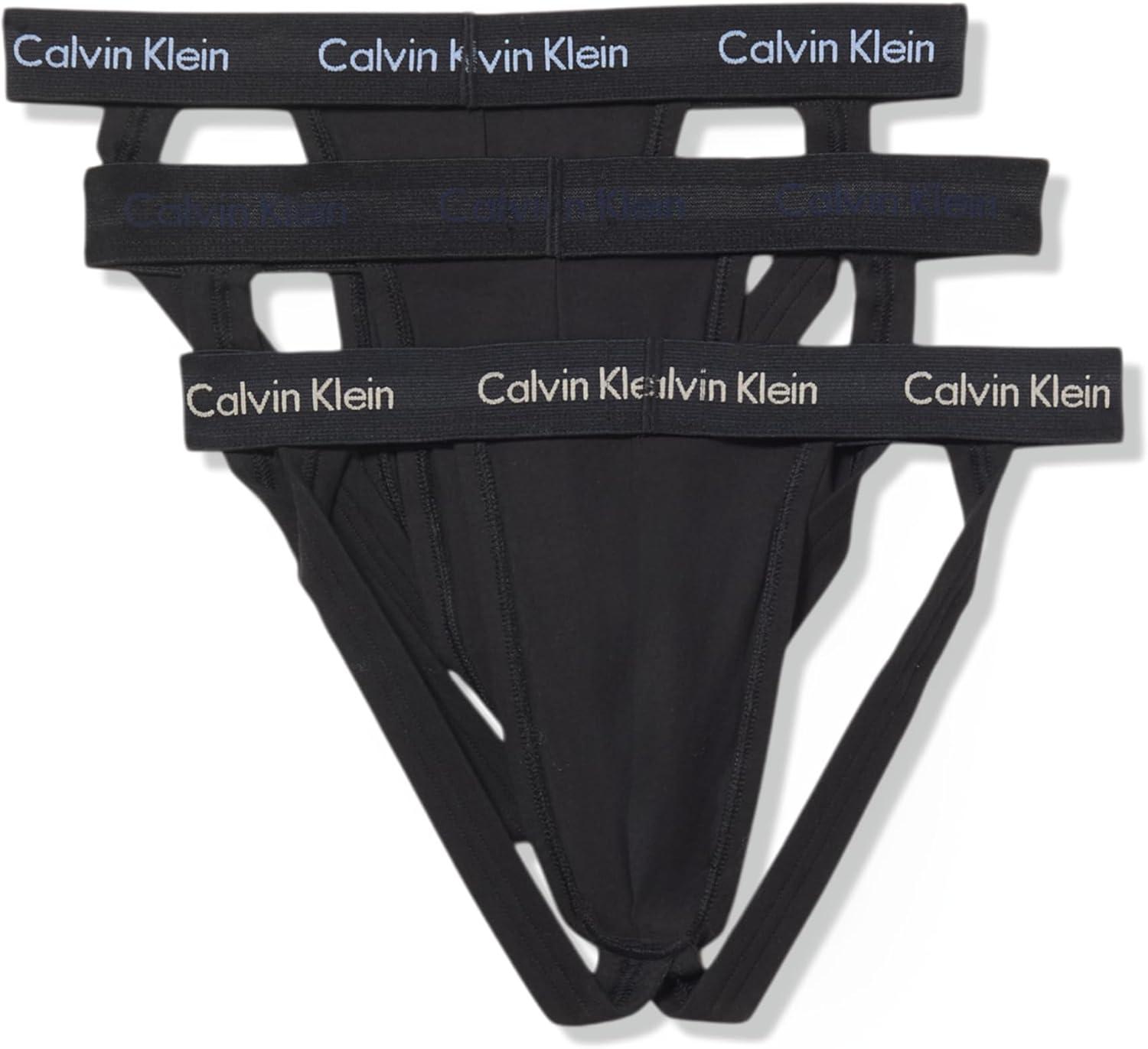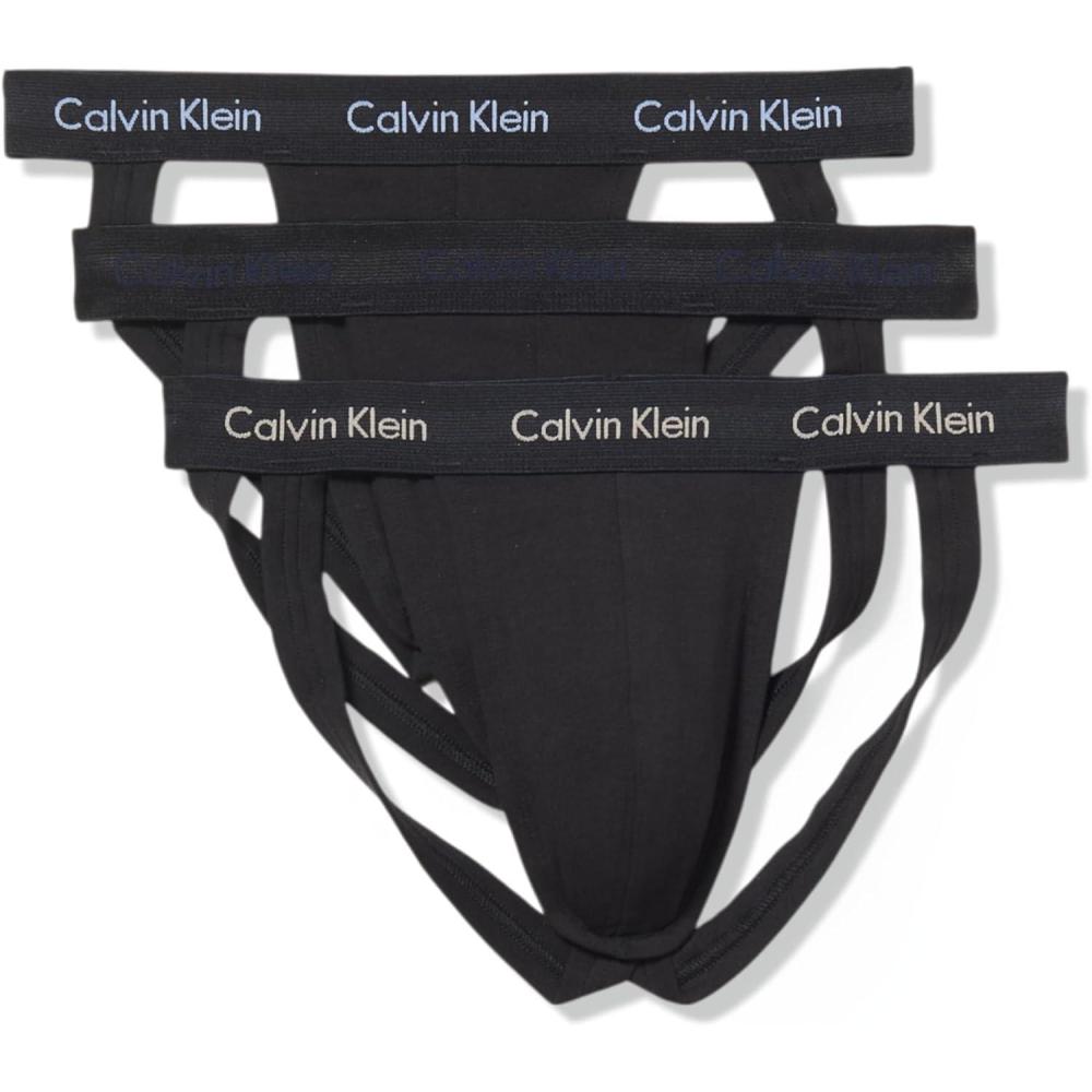 Calvin Klein Men’s Cotton Stretch 3-Pack Jock Strap(Black W/ New Navy Vintage Khaki Troposphere Logos)