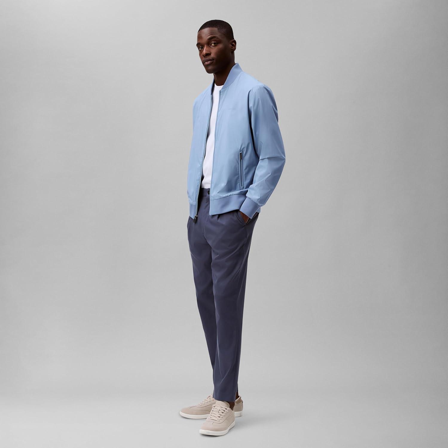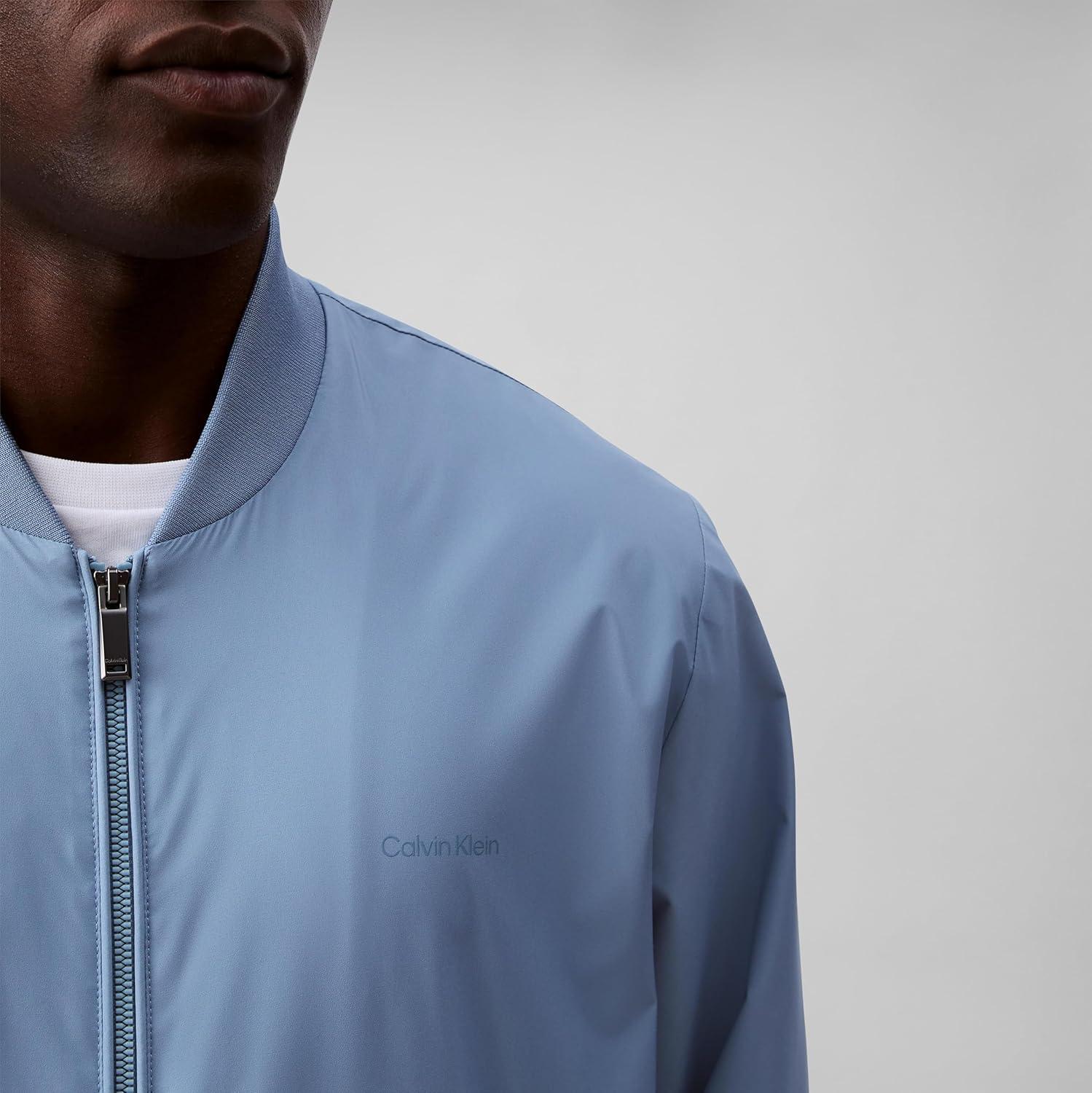 Contemporary and versatile, this Calvin Klein jacket is made with durable water-resistant polyester with a solid matte finish. Detailed with a round neckline, a full zip front, side zip pockets, a compact logo at the chest and ribbed knit trim for an ideal, snug fit.