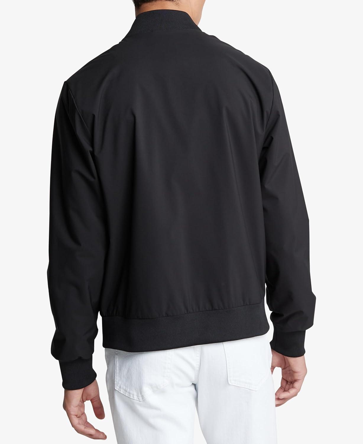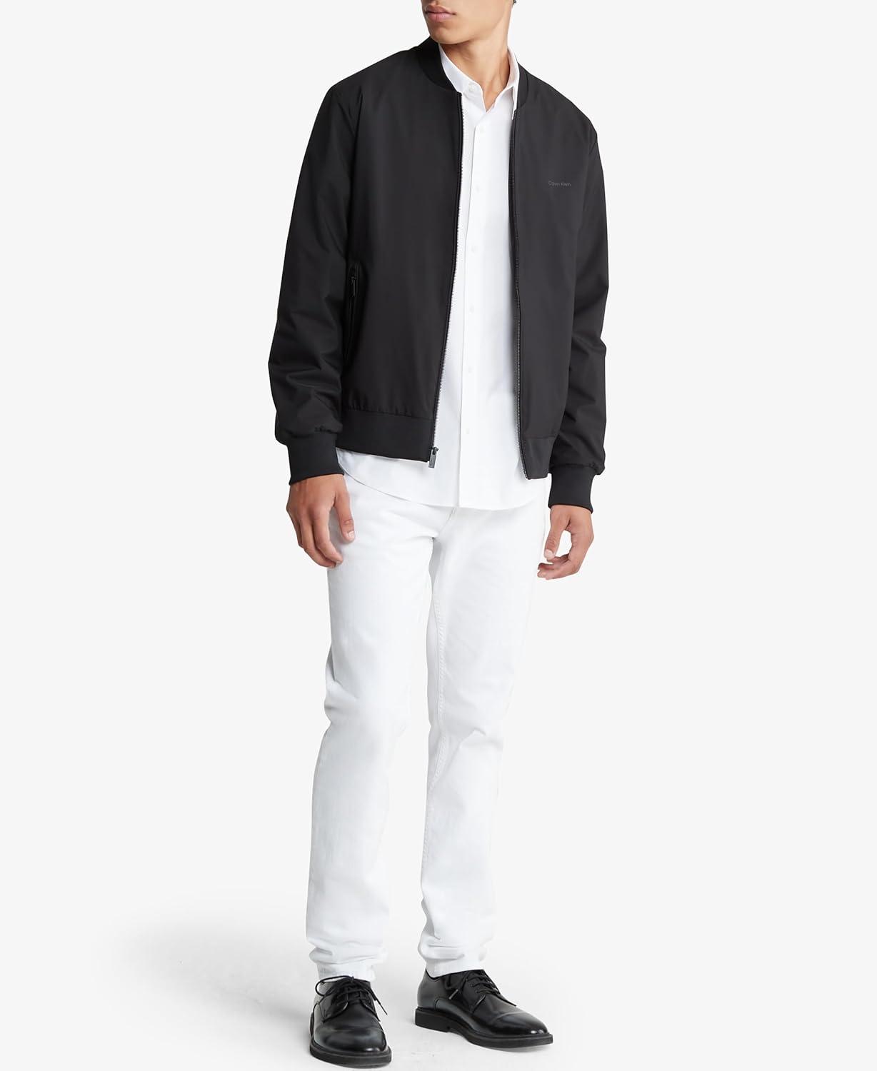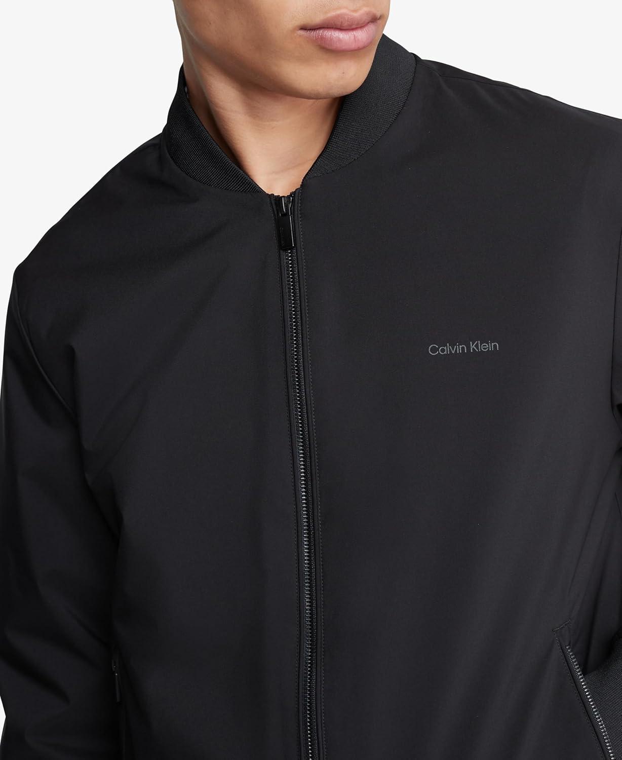 Contemporary and versatile, this Calvin Klein jacket is made with durable water-resistant polyester with a solid matte finish. Detailed with a round neckline, a full zip front, side zip pockets, a compact logo at the chest and ribbed knit trim for an ideal, snug fit.