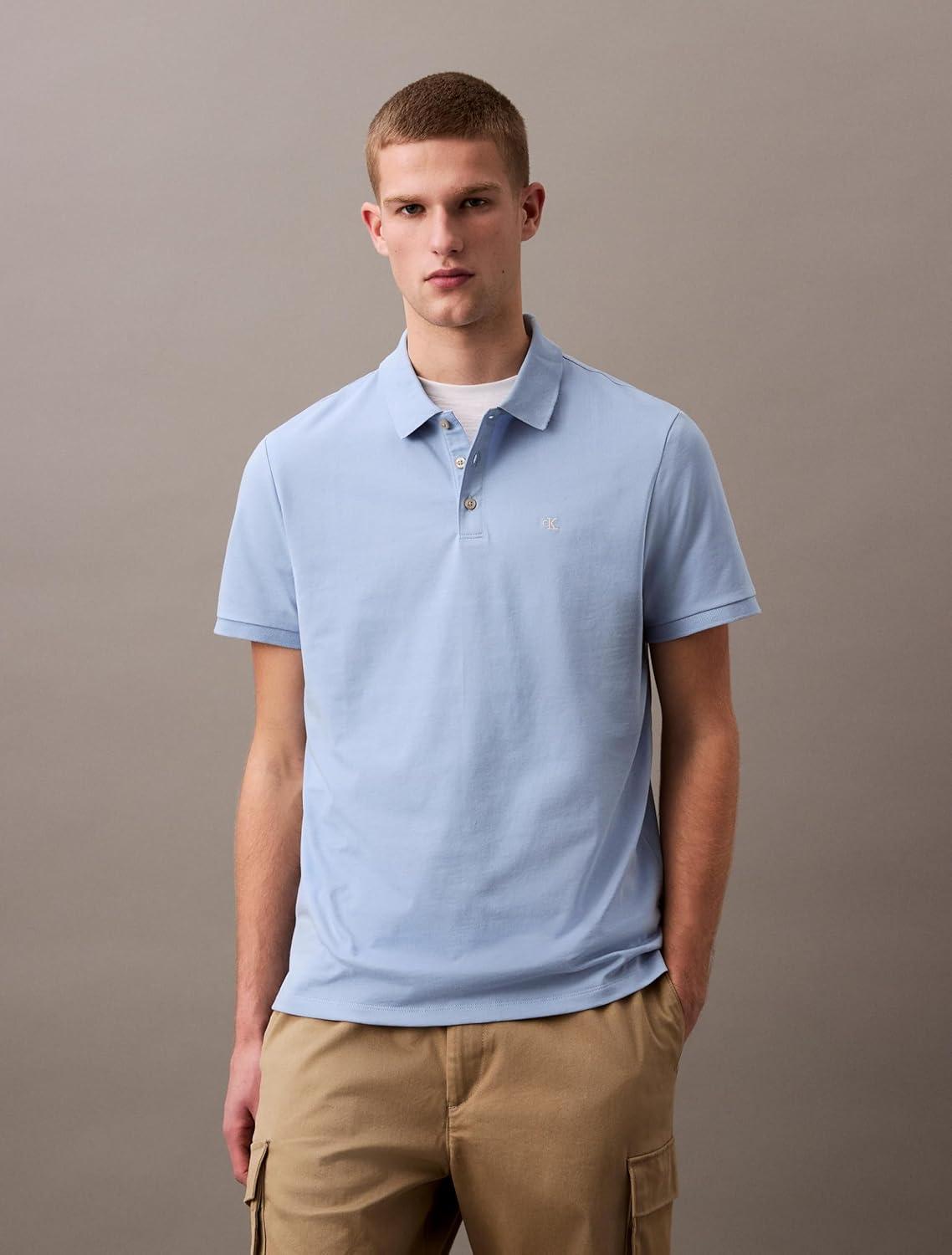 Sporty and modern, this signature Calvin Klein polo shirt is crafted from a compact cotton blend for a smooth hand with an extra sleek feel. Made with an embroidered monogram logo in a diverse array of seasonal colors. Perfect for the court or warm-weather special occasions, this pullover top is detailed with a compact logo at the chest, a covered placket polo shirt collar and a vented hem for an effortless fit.