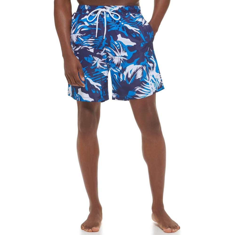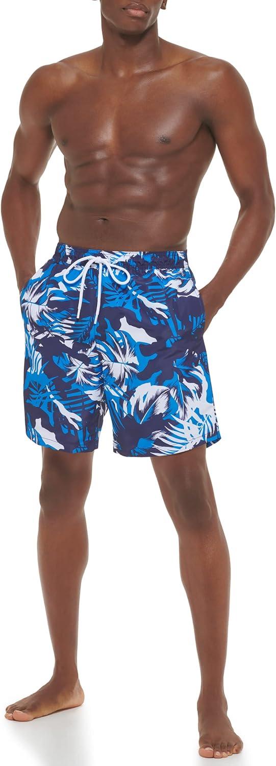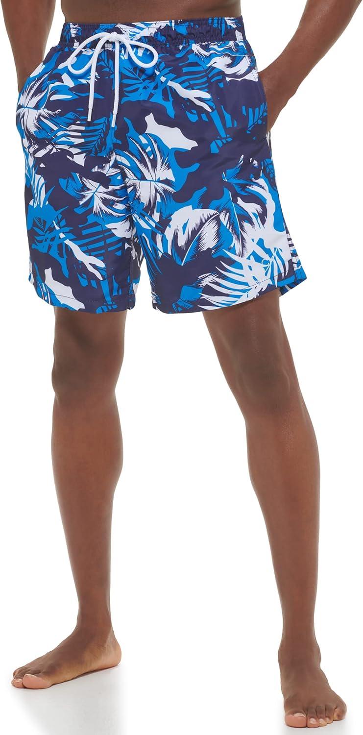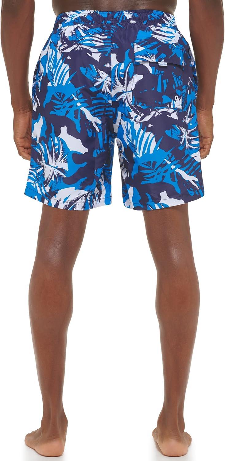 Calvin Klein Men's Standard Uv Protected Quick Dry Drawstring Patterned Swim Trunk(Blue Palm)
