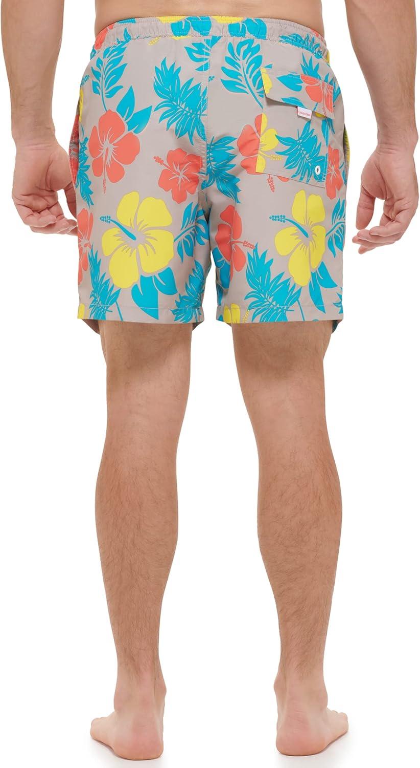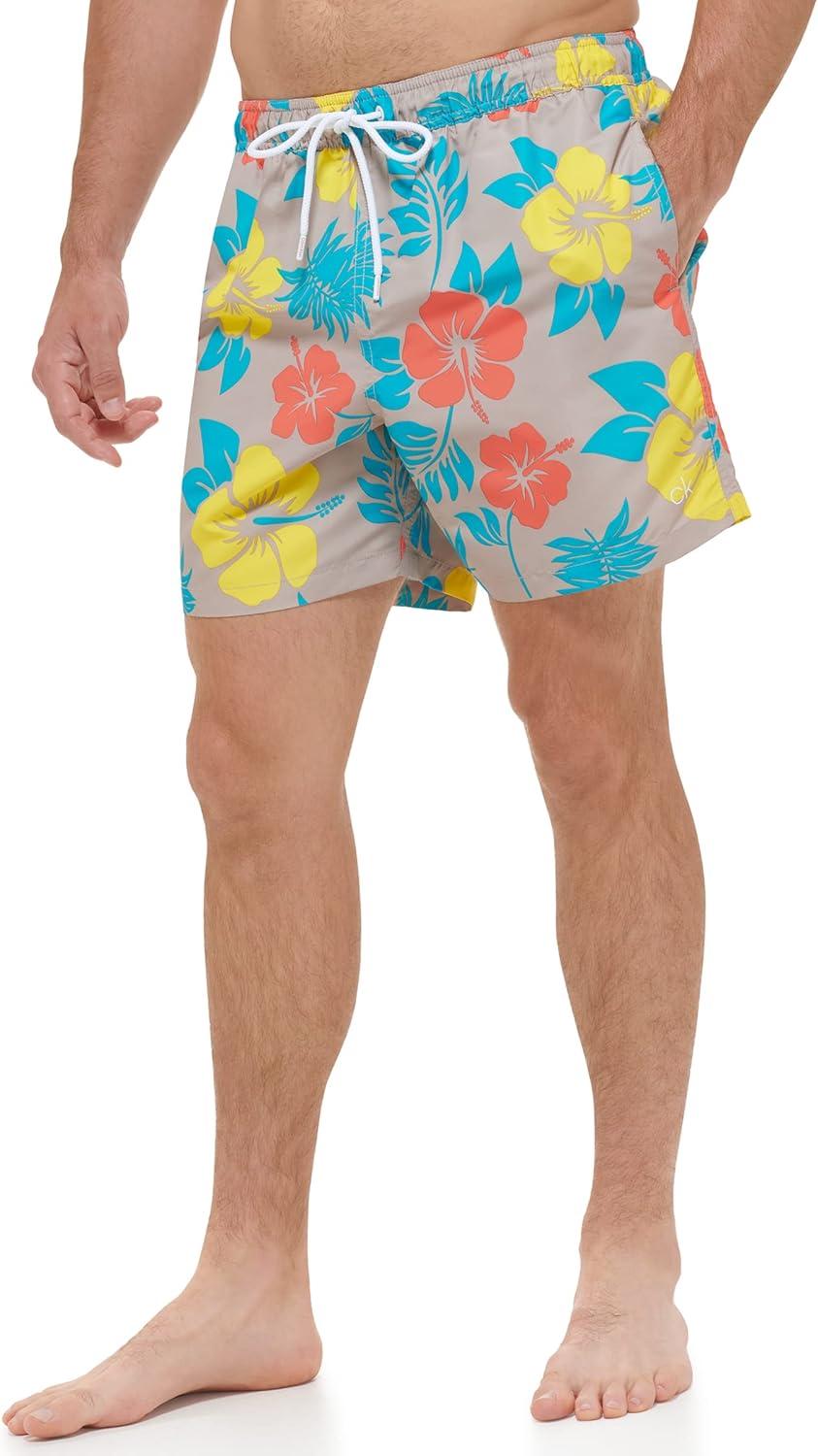 Calvin Klein Men’s Standard Uv Protected Quick Dry Drawstring Patterned Swim Trunk(Tan Multi Aloha)