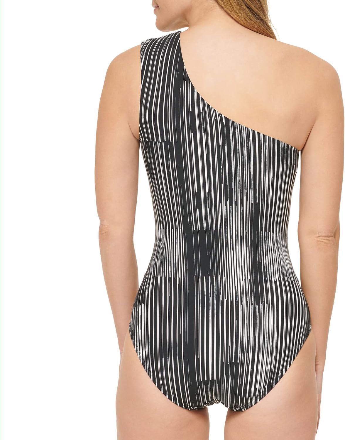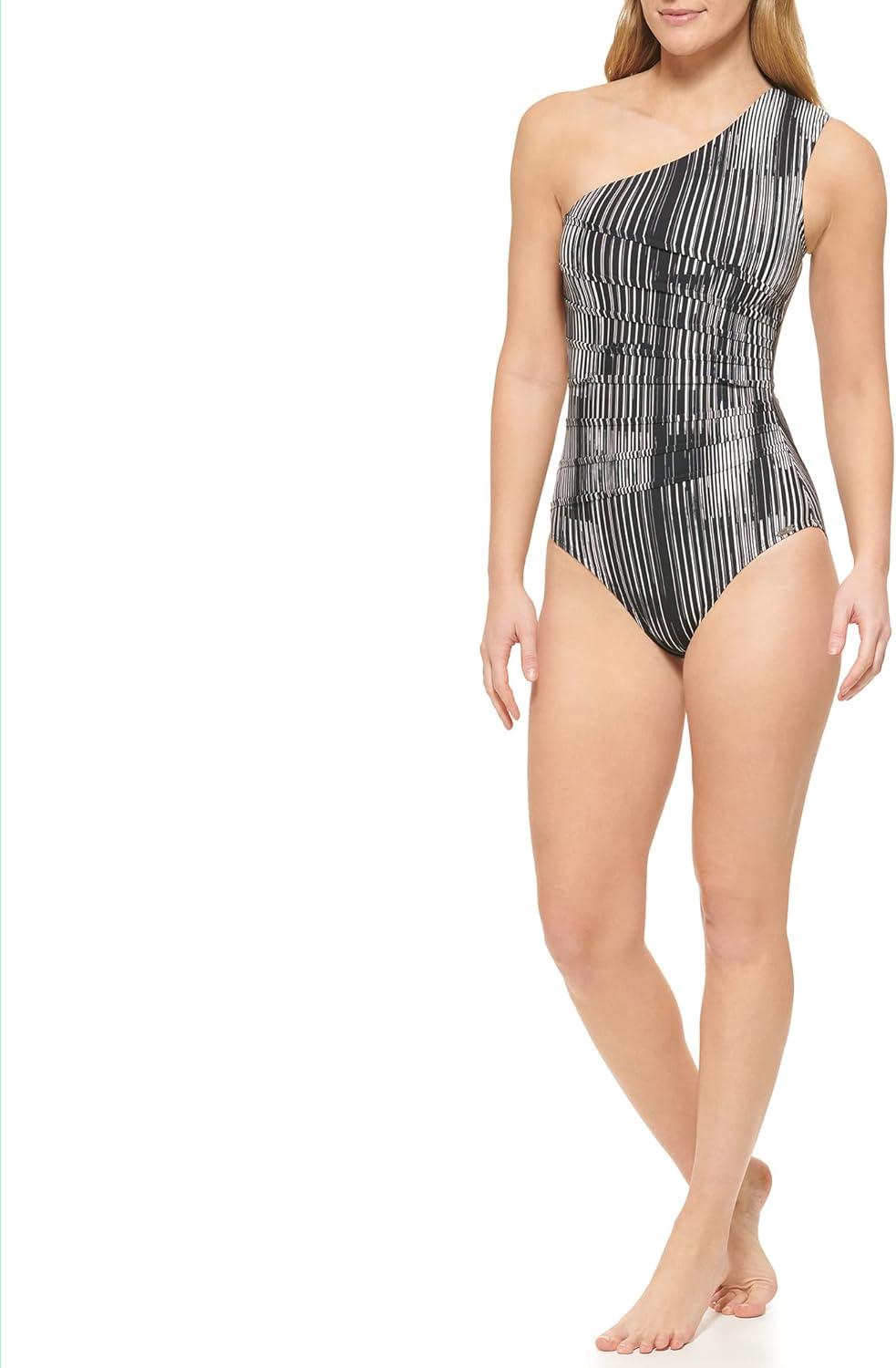 This Calvin Klein womens LIFESTYLE ONE PIECE is a One shoulder strap Starburst pleating Removable soft cups