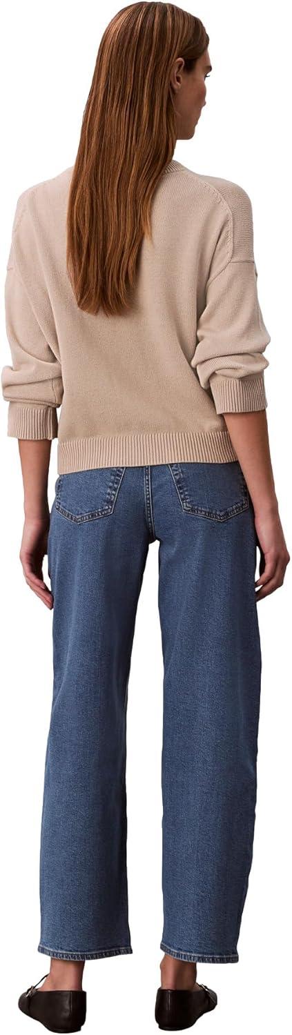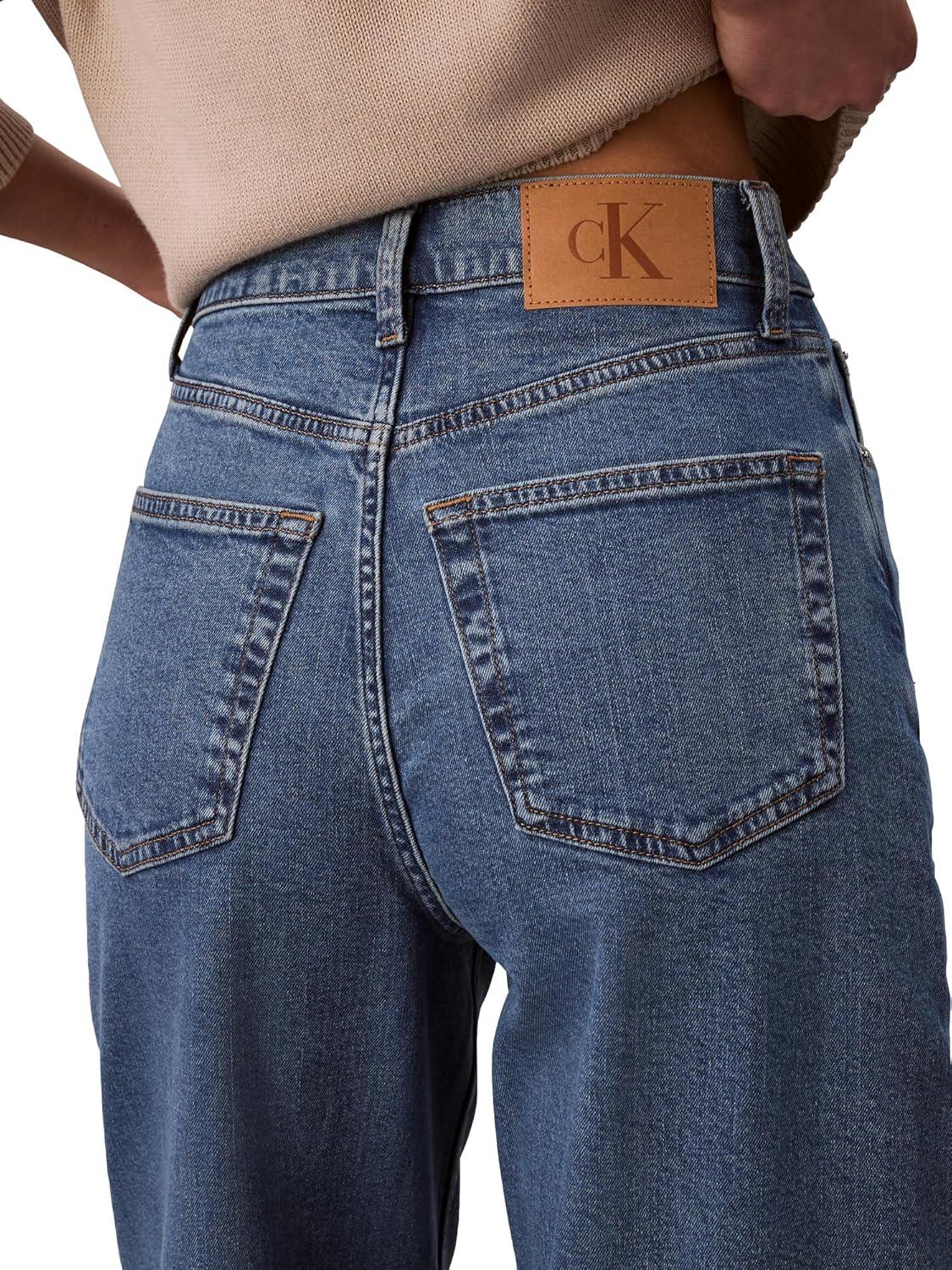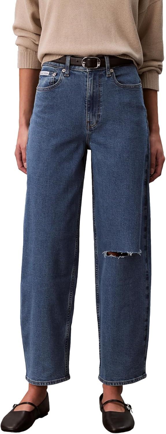 Cut with a high rise waist, these barrel jeans have a tapered wide leg fit. Features classic 5-pocket styling with topstitching and seaming details for elevated shaping. Detailed with Calvin Klein signature hardware and a monogram logo patch at the back waist. Crafted from cotton stretch denim for comfortable wear.