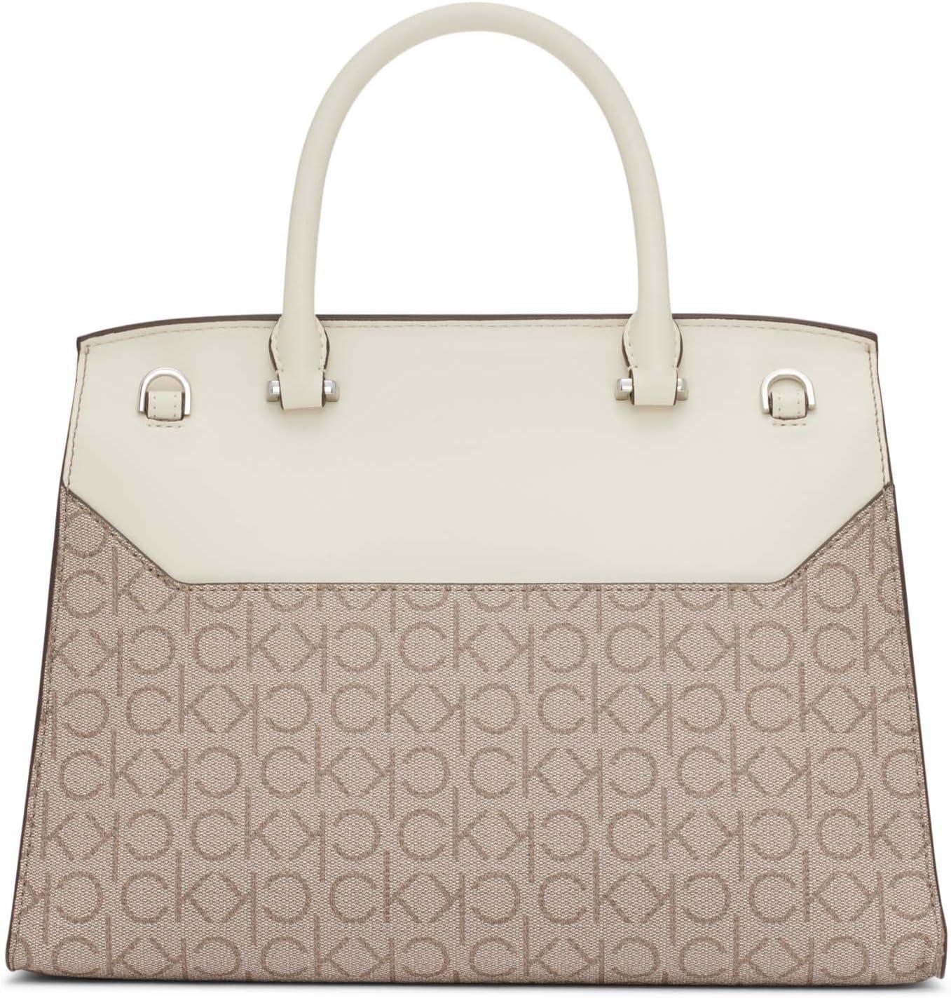 Calvin Klein Women's Becky Turn Lock Satchel – 2 in 1, Vegan Leather, 3 Pockets(Almond/Taupe/White)