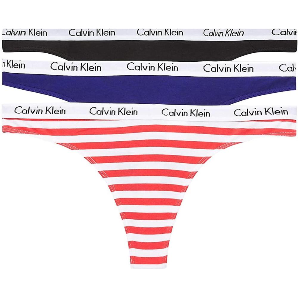 Calvin Klein Women’s Carousel Logo Cotton Stretch Thong Panties, 3 Pack(Rainer Stripe Strawberry Shake/Royalty/Black)