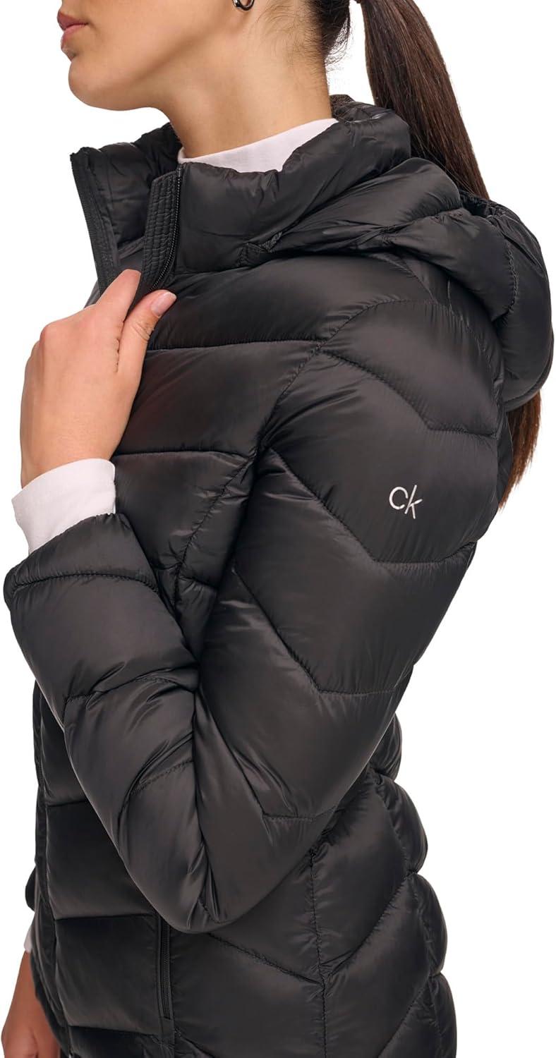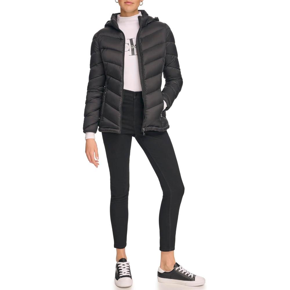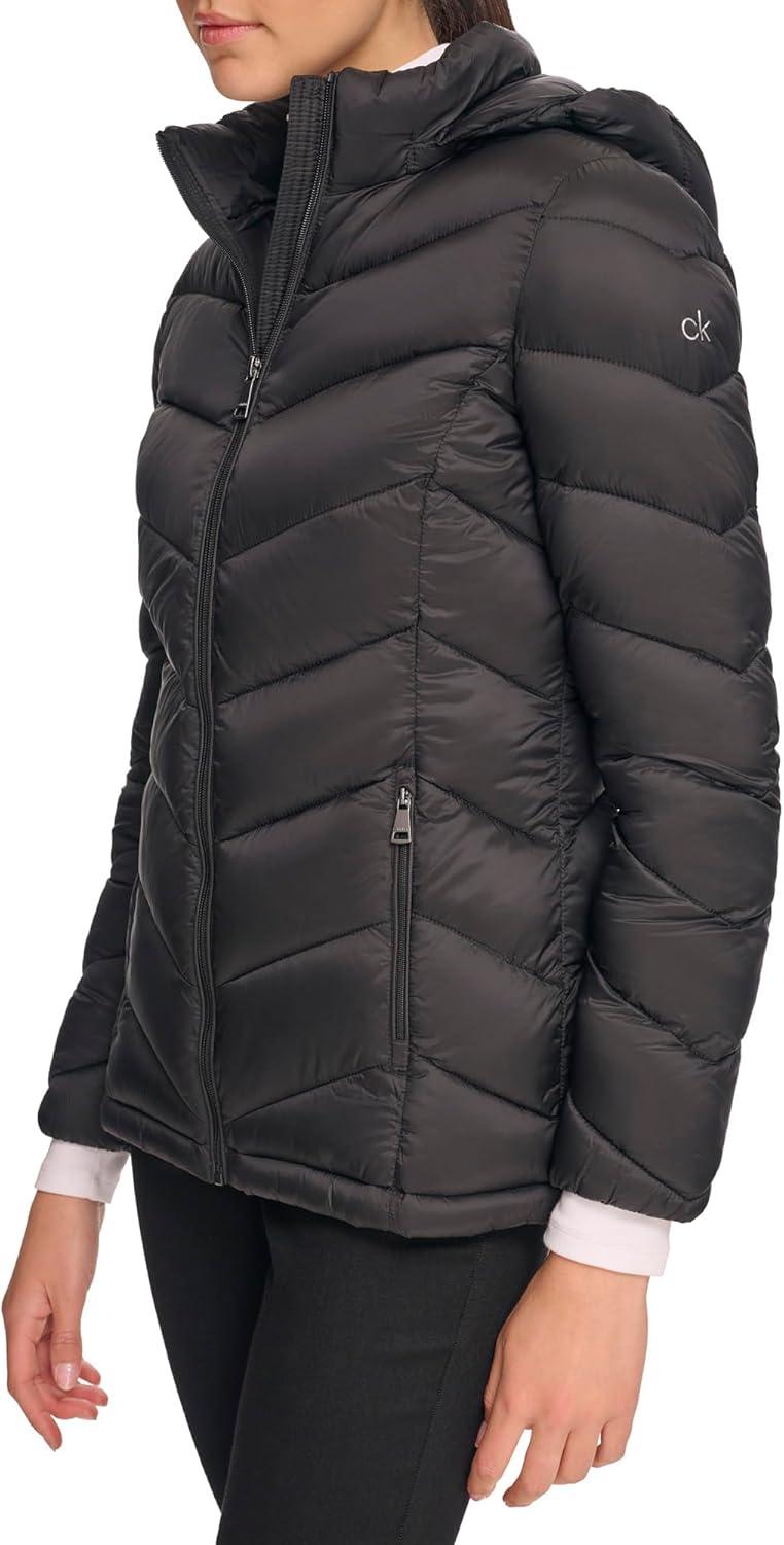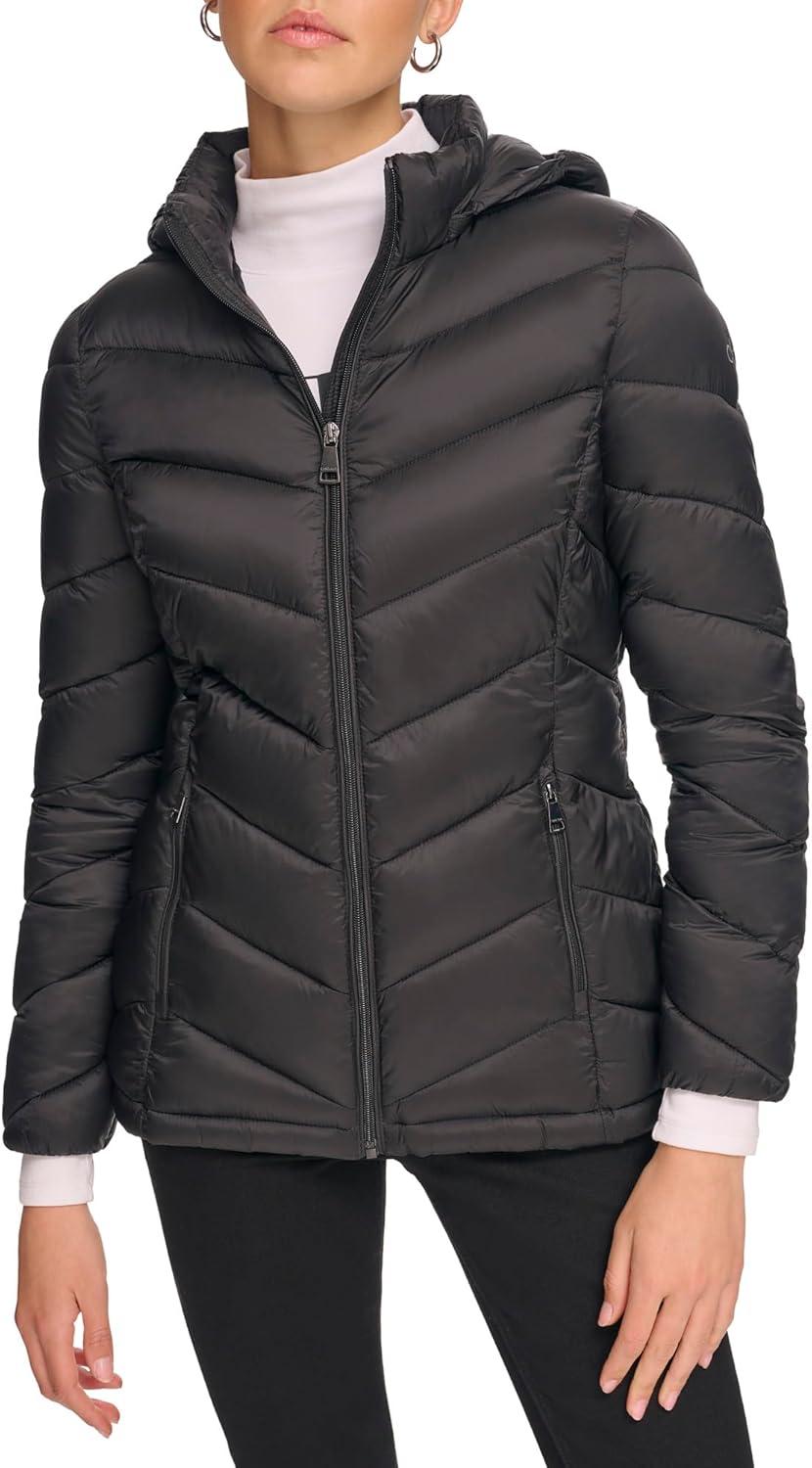 Calvin Klein Women’s Classic Hooded Zip Front Puffer Coat(Light-weight Chevron Black)