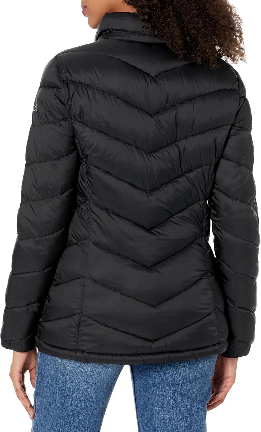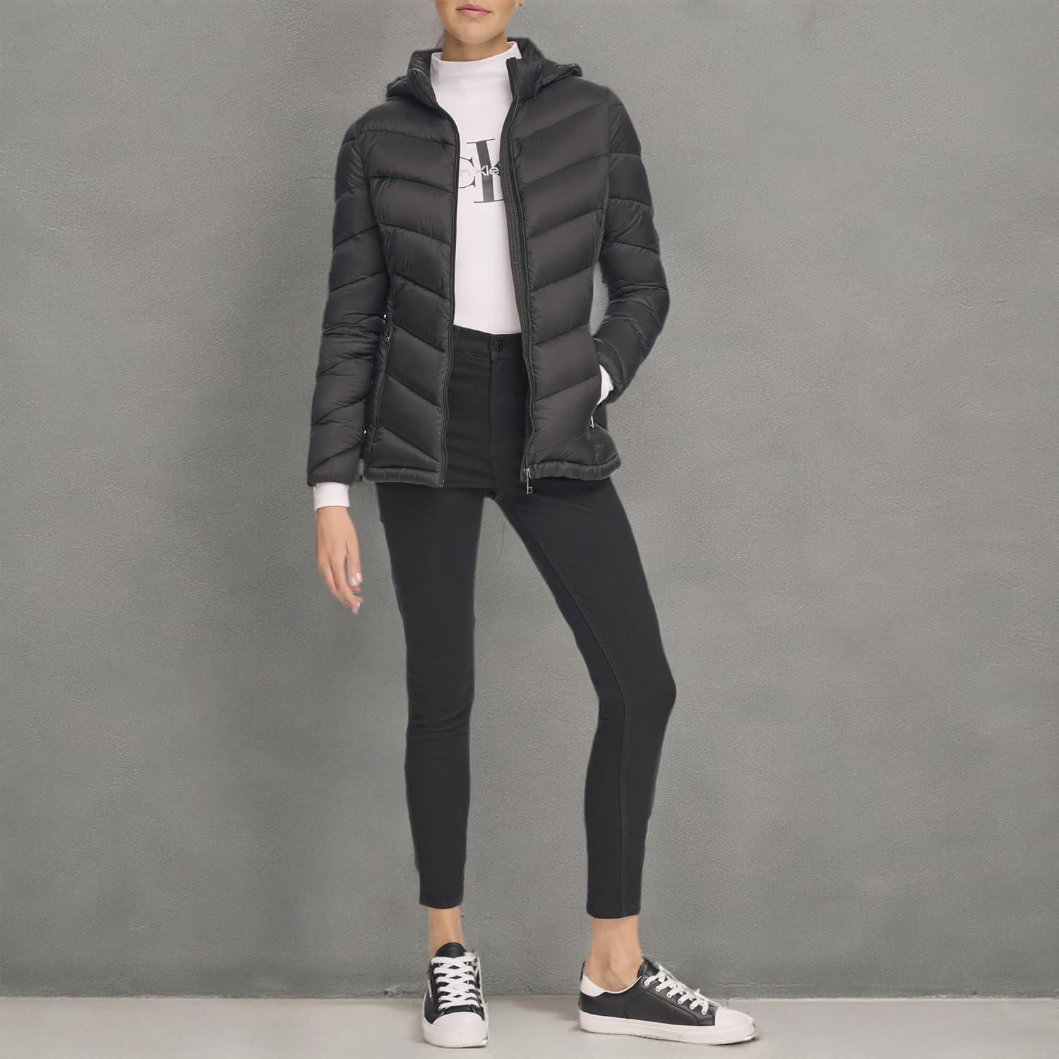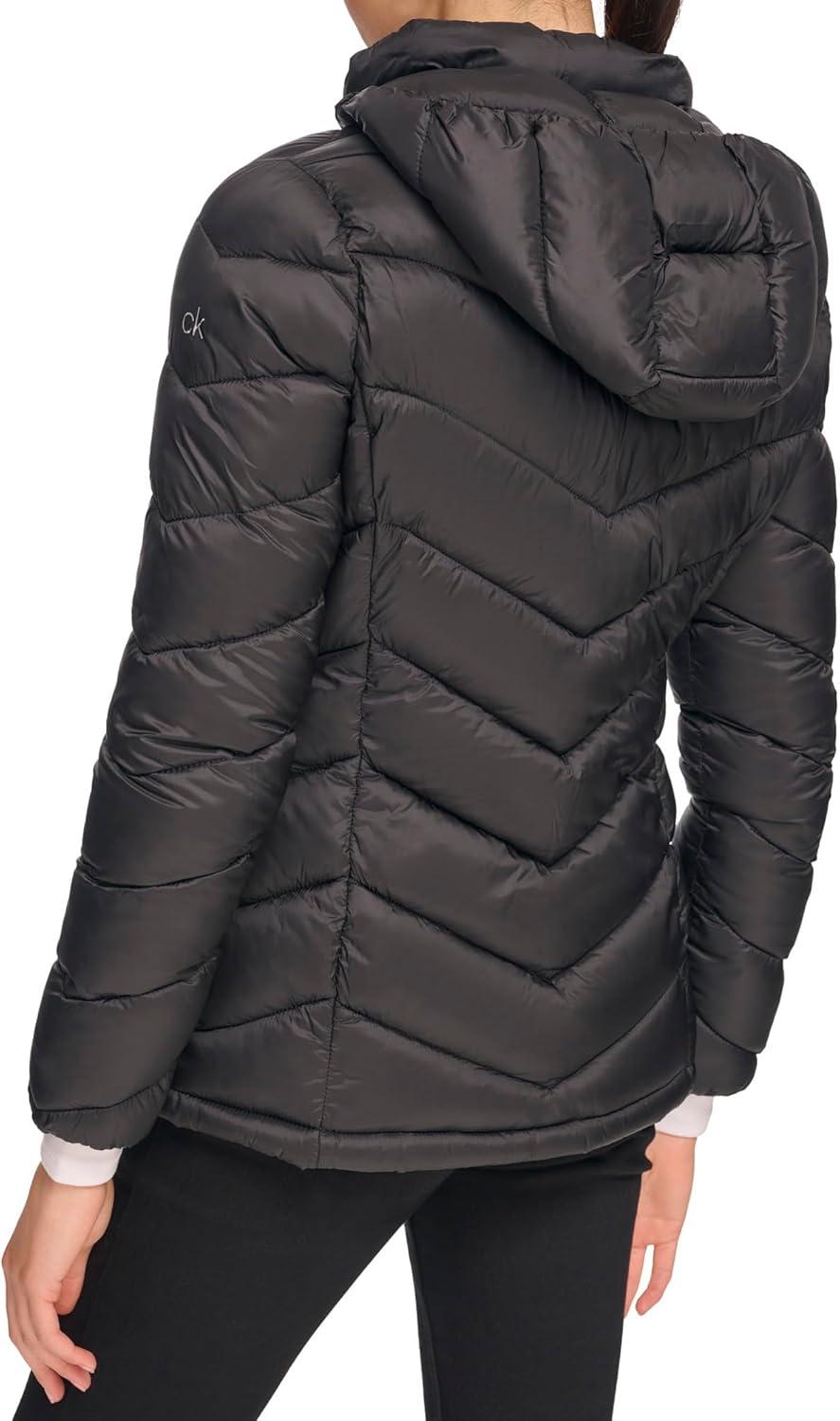 Calvin Klein Women’s Classic Hooded Zip Front Puffer Coat(Light-weight Chevron Black)
