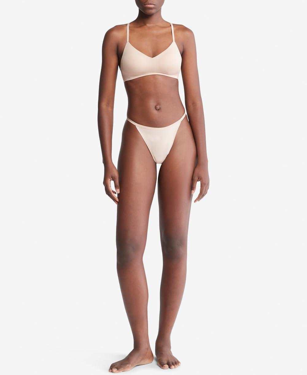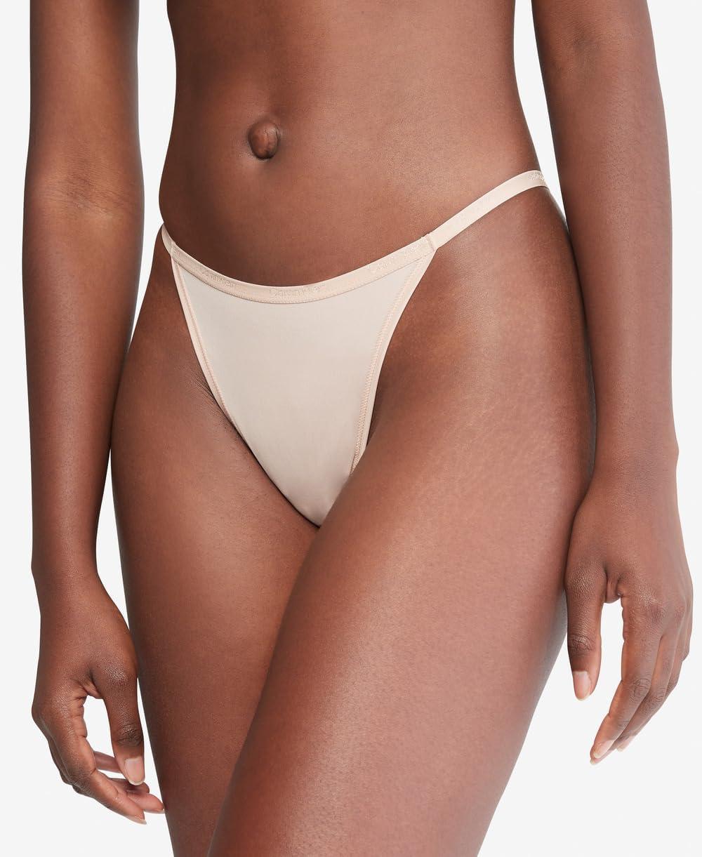 A core Calvin Klein string thong, crafted from silky soft microfiber stretch for a smooth touch with added flexibility. Designed with a slim repeating logo elastic waistband for excellent recovery and a minimal coverage t-back silhouette.