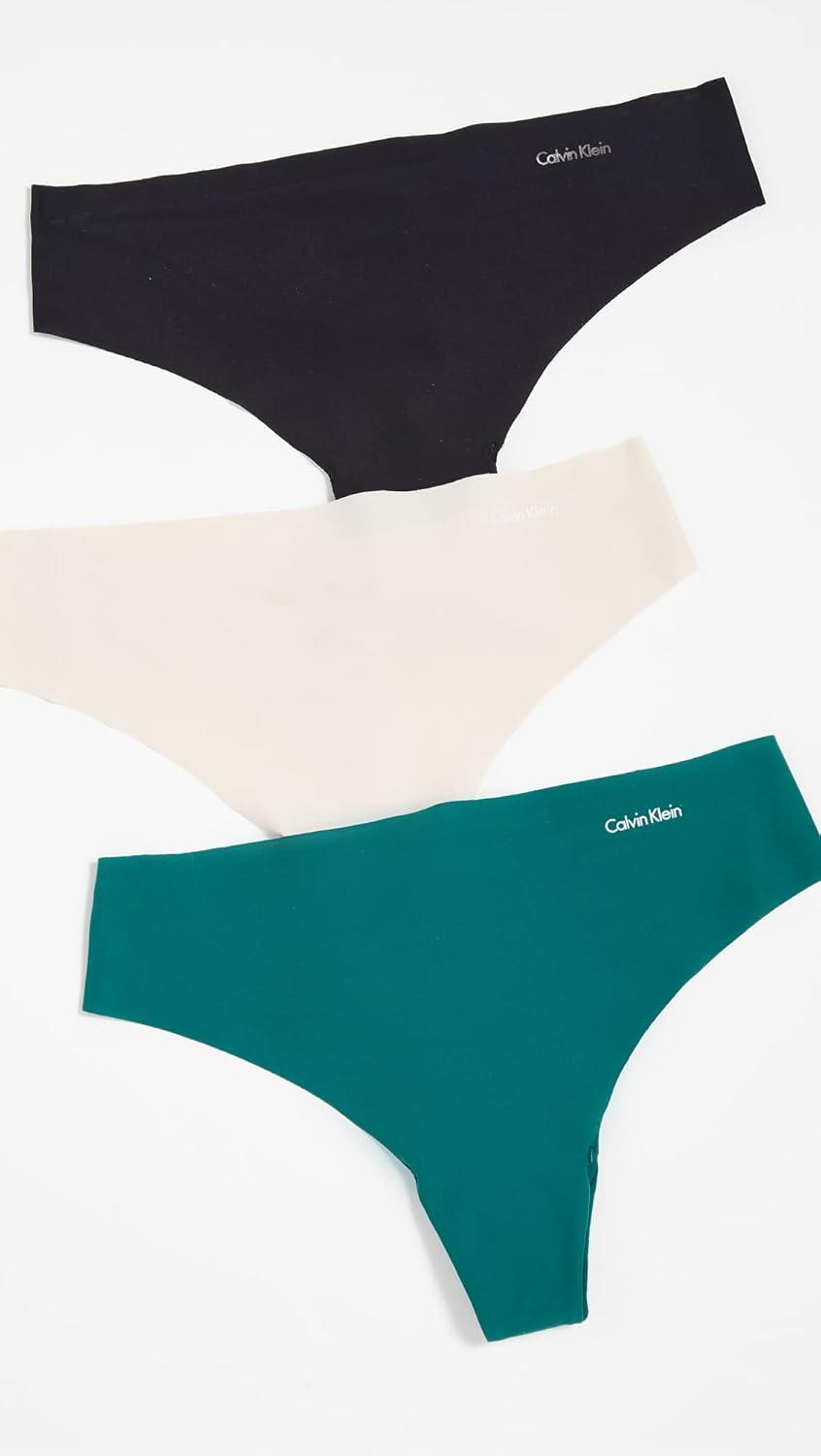 Calvin Klein Women’s Invisibles Seamless Thong Panties, 3 Pack(Topaz Gemstone/Buff Beige/Black)