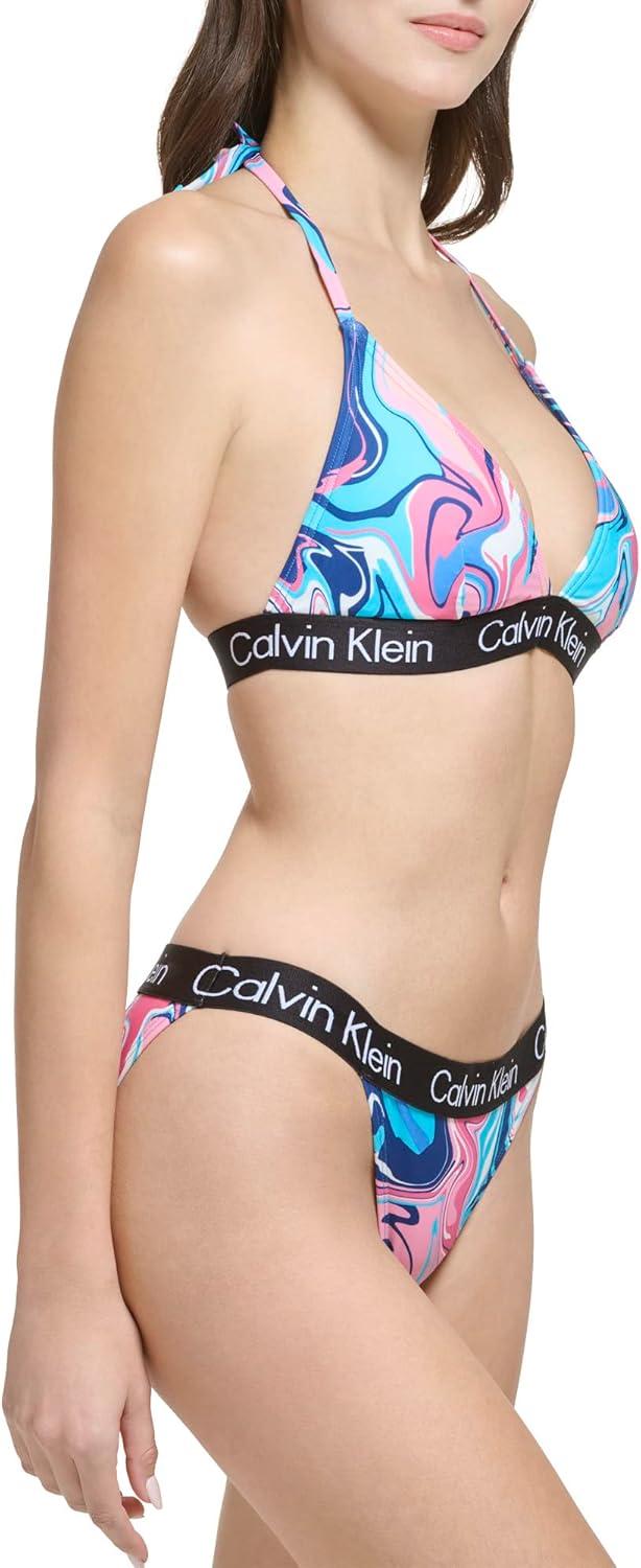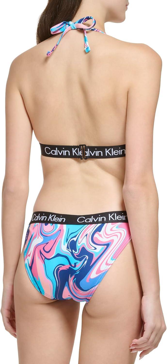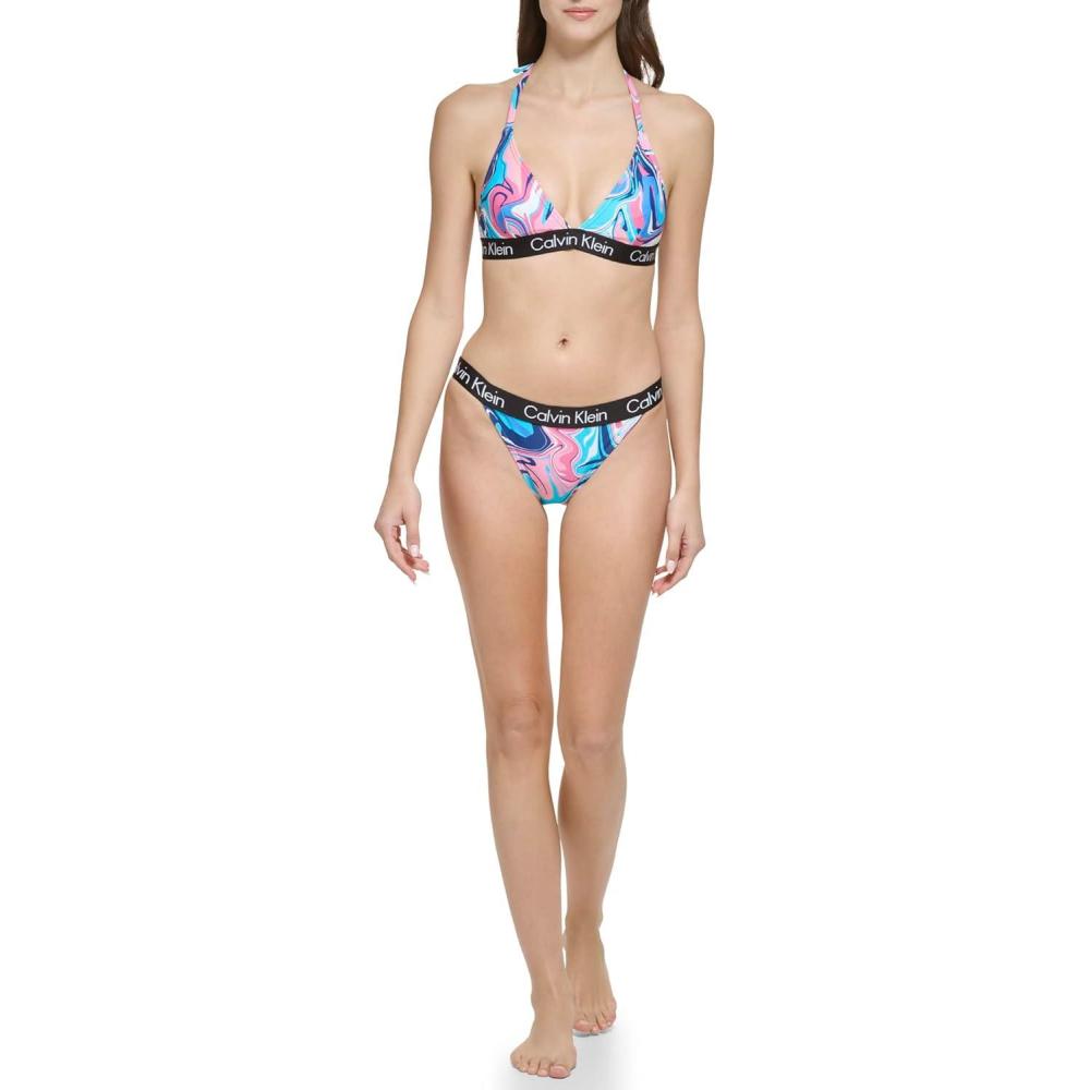 This Calvin Klein Women's Lifestyle 2 Piece Set is a Halter tie bikini top removable soft cups logo elastic bikini bottom shimmer fabric