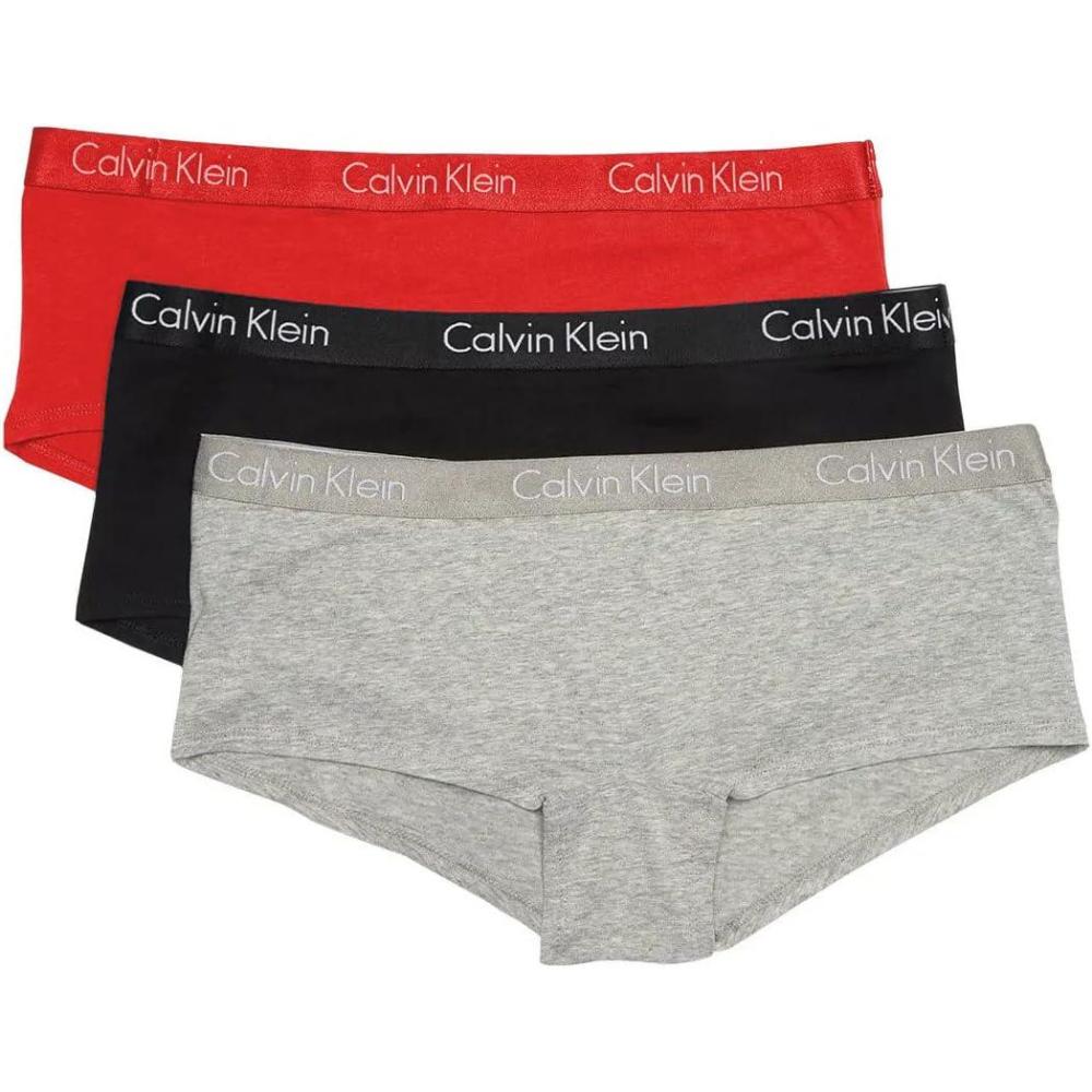 Calvin Klein Women’s Motive Cotton Boyshort Panties, 3 Pack(Black/Heather Grey/Red 020)