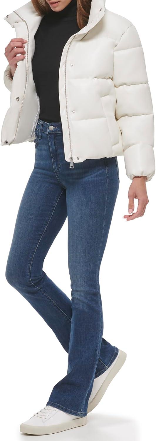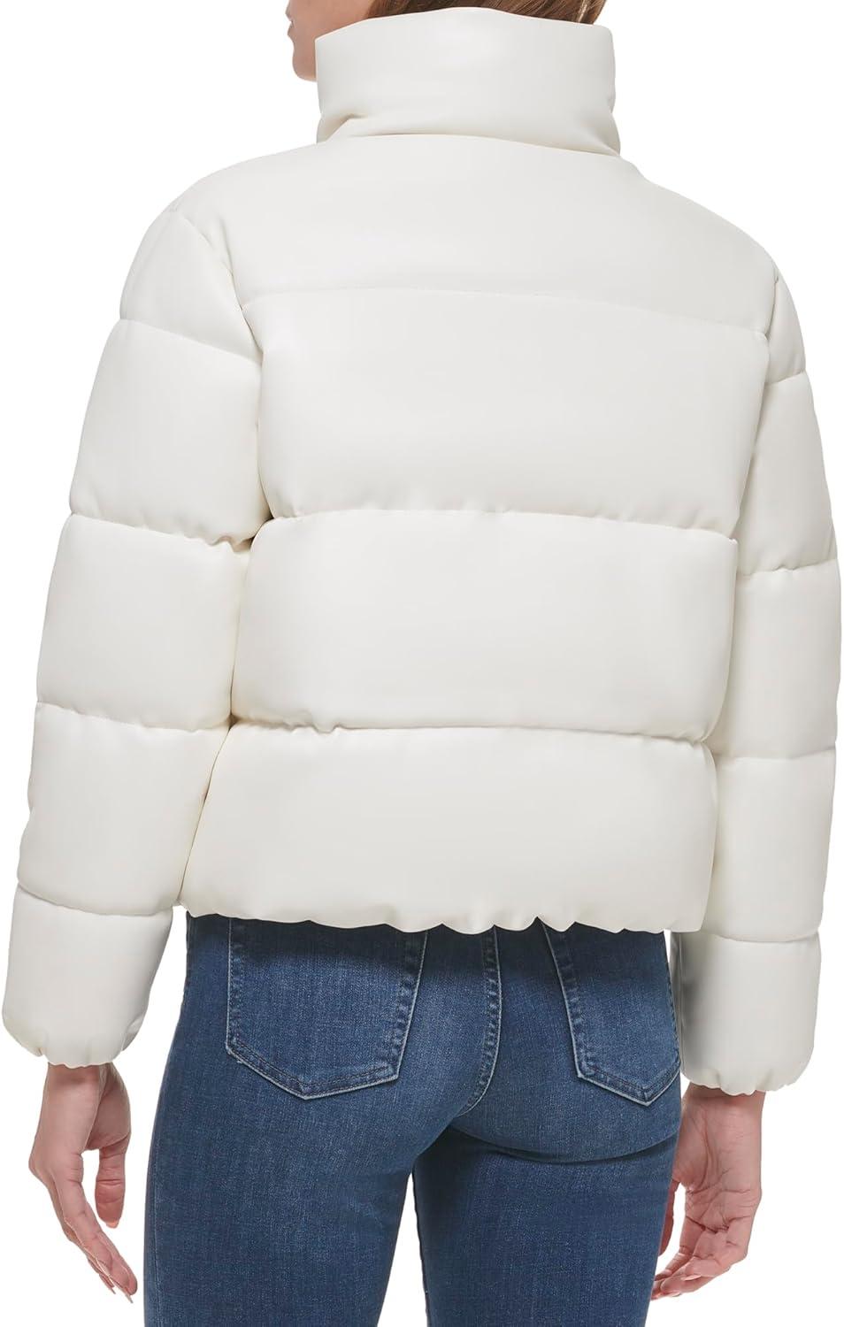 This Calvin Klein Women's Outerwear Jacket is a Short Faux-Leather Puffer